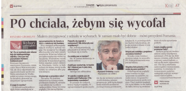 - Jedyną propozycją, jaką miałem ze strony PO, było wycofanie się ze startu - mówił Grobelny w rozmowie z "Rzeczpospolitą" tuż przed wyborami. A na pytanie, co miał dostać w zamian, odparł: - Nic. W zamian deklaracja, że będzie dobrze.